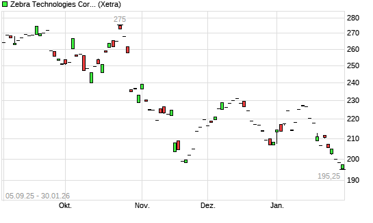 Mit dem Rücksetzer auf 196,60 EUR hat die Zebra Technologies-Aktie (ISIN US9892071054) am 29.01.2026 ein neues 6-Monats-Tief erreicht und damit den Kurs vom 21.11.2025 eingestellt.Die Zebra ...weiterlesen