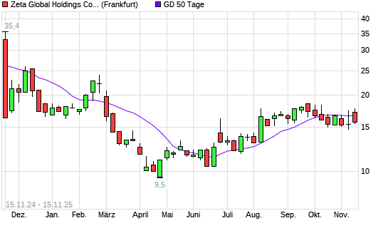 Mit dem Rücksetzer auf 15,70 EUR hat die Zeta Global Holdings Aktie-Aktie am 14.11.2025 die 50-Tage-Linie nach unten gekreuzt.Die Zeta Global Holdings Aktie-Aktie befindet sich seit dem ...weiterlesen