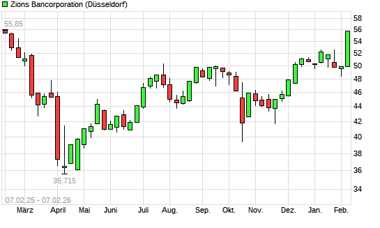 Mit dem Anstieg auf 53,97 EUR hat die Zions Bancorporation-Aktie (ISIN US9897011071) am 06.02.2026 ein neues 6-Monats-Hoch erreicht und damit den Kurs vom 05.02.2026 eingestellt.Die Zions Bancorporation-Aktie ...weiterlesen