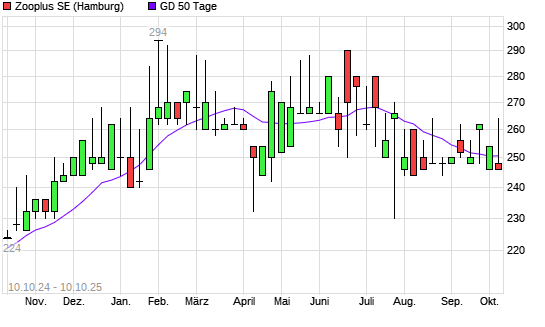 Mit dem Rücksetzer auf 248,00 EUR hat die Zooplus-Aktie am 09.10.2025 die 50-Tage-Linie nach unten gekreuzt.Die Zooplus-Aktie befindet sich seit dem 08.10.2025 im langfristigen Abwärtstrend ...weiterlesen