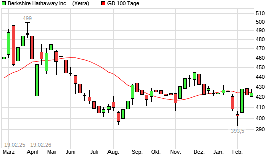 Mit dem Rücksetzer auf 423,65 EUR hat die Berkshire Hathaway B-Aktie am 18.02.2026 die 100-Tage-Linie nach unten gekreuzt.Die Berkshire Hathaway B-Aktie befindet sich seit ...weiterlesen