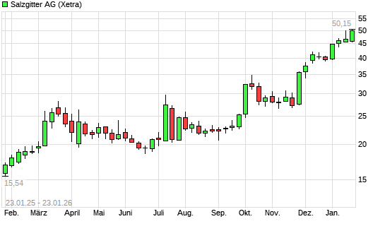 Mit dem Anstieg auf 49,52 EUR hat die Salzgitter-Aktie (ISIN DE0006202005) am 22.01.2026 ein neues 5-Jahres-Hoch erreicht und damit den Kurs vom 13.01.2026 eingestellt.Die Salzgitter-Aktie befindet ...weiterlesen