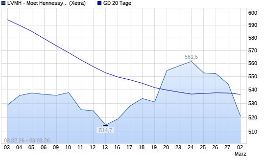 Mit dem Rücksetzer auf 519,70 EUR hat die LVMH Moët Hennessy Louis Vuitton-Aktie am 02.03.2026 die 20-Tage-Linie nach unten gekreuzt.Die LVMH Moët Hennessy Louis ...weiterlesen