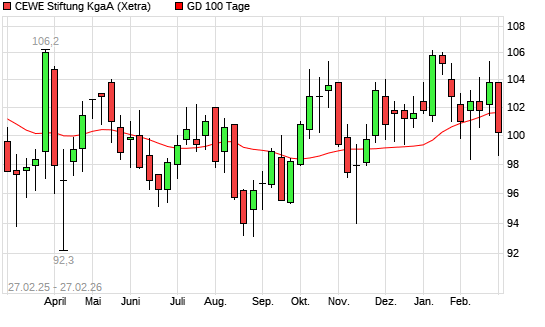 Mit dem Rücksetzer auf 100,20 EUR hat die Cewe Stiftung-Aktie am 26.02.2026 die 100-Tage-Linie nach unten gekreuzt.Die Cewe Stiftung-Aktie befindet sich seit dem 20.11.2025 ...weiterlesen