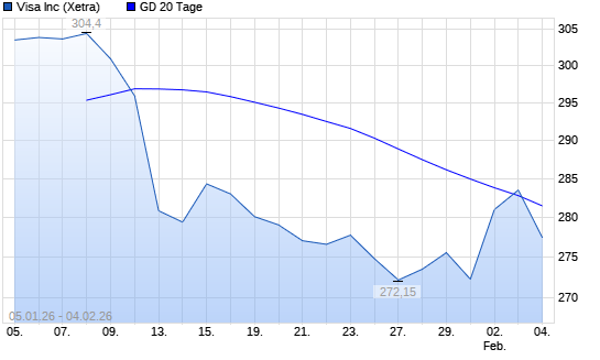 Mit dem Anstieg auf 283,10 EUR hat die Visa-Aktie am 03.02.2026 die 20-Tage-Linie nach oben gekreuzt.Die Visa-Aktie befindet sich seit dem 12.01.2026 im langfristigen Abwärtstrend und ...weiterlesen