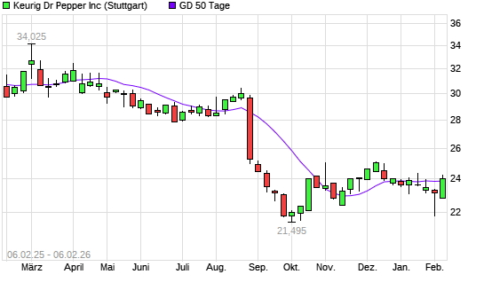 Mit dem Rücksetzer auf 23,54 EUR hat die Keurig Dr Pepper-Aktie am 05.02.2026 die 50-Tage-Linie nach unten gekreuzt.Die Keurig Dr Pepper-Aktie befindet sich seit dem 22.08.2025 ...weiterlesen