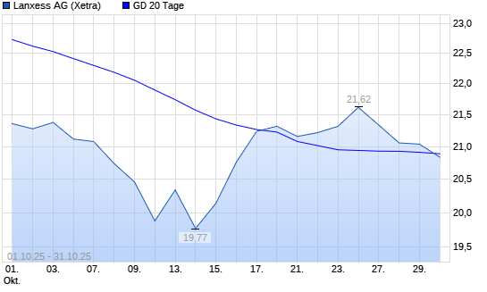Mit dem Rücksetzer auf 20,80 EUR hat die Lanxess-Aktie am 30.10.2025 die 20-Tage-Linie nach unten gekreuzt.Die Lanxess-Aktie befindet sich seit dem 25.07.2025 im langfristigen Abwärtstrend ...weiterlesen