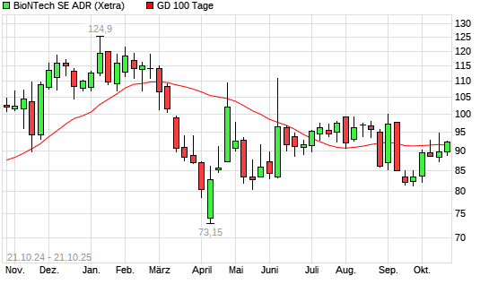 Mit dem Anstieg auf 92,60 EUR hat die BioNTech-Aktie am 20.10.2025 die 100-Tage-Linie nach oben gekreuzt.Die BioNTech-Aktie befindet sich seit dem 04.06.2025 im langfristigen Abwärtstrend und ...weiterlesen