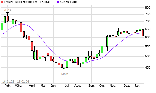 Mit dem Rücksetzer auf 627,70 EUR hat die LVMH Moët Hennessy Louis Vuitton-Aktie am 15.01.2026 die 50-Tage-Linie nach unten gekreuzt.Die LVMH Moët Hennessy Louis ...weiterlesen