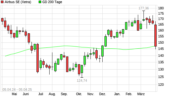 Mit dem Rücksetzer auf 145,26 EUR hat die Airbus-Aktie am 04.04.2025 die 200-Tage-Linie nach unten gekreuzt.Die Airbus-Aktie befand sich seit dem 29.11.2024 im langfristigen Aufwärtstrend ...weiterlesen