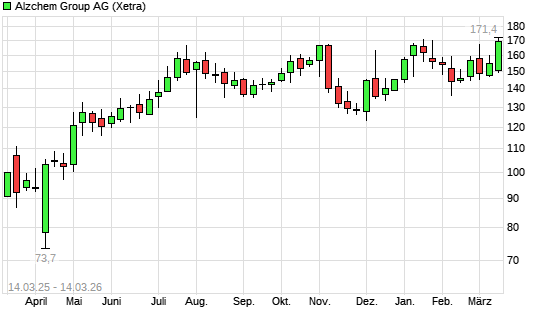 Mit dem Anstieg auf 170,00 EUR hat die Alzchem-Aktie (ISIN DE000A2YNT30) am 13.03.2026 ein neues 10-Jahres-Hoch erreicht und damit den Kurs vom 09.01.2026 eingestellt.Die ...weiterlesen