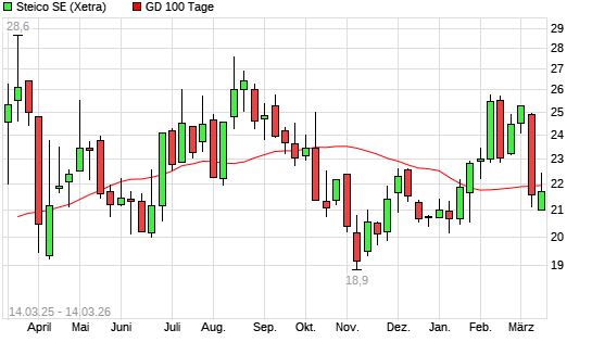 Mit dem Rücksetzer auf 21,35 EUR hat die Steico-Aktie am 13.03.2026 die 100-Tage-Linie nach unten gekreuzt.Die Steico-Aktie befindet sich seit dem 06.03.2026 im ...weiterlesen