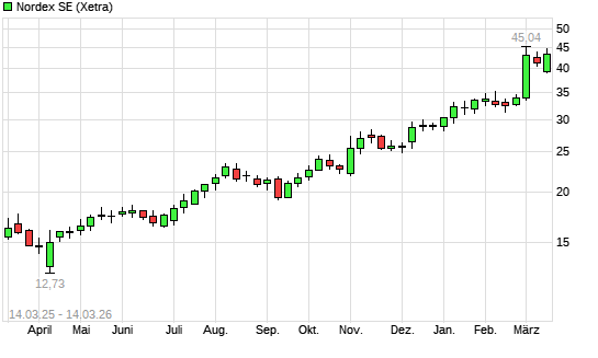 Mit dem Anstieg auf 44,30 EUR hat die Nordex-Aktie (ISIN DE000A0D6554) am 13.03.2026 ein neues 10-Jahres-Hoch erreicht und damit den Kurs vom 11.03.2026 eingestellt.Die ...weiterlesen