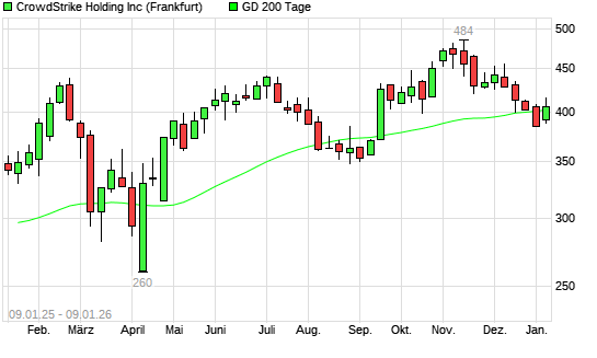 Mit dem Anstieg auf 407,75 EUR hat die CrowdStrike-Aktie am 08.01.2026 die 200-Tage-Linie nach oben gekreuzt.Die CrowdStrike-Aktie befand sich seit dem 02.01.2026 im langfristigen Abwärtstrend ...weiterlesen