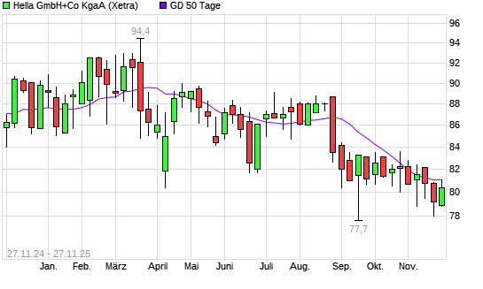 Mit dem Anstieg auf 80,80 EUR hat die Hella-Aktie am 26.11.2025 die 50-Tage-Linie nach oben gekreuzt.Die Hella-Aktie befindet sich seit dem 25.08.2025 im langfristigen Abwärtstrend und hat in ...weiterlesen