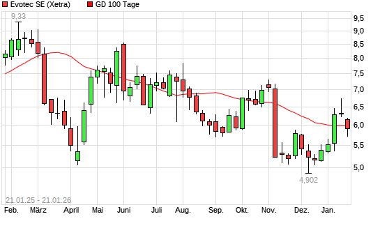 Mit dem Rücksetzer auf 5,86 EUR hat die Evotec-Aktie am 20.01.2026 die 100-Tage-Linie nach unten gekreuzt.Die Evotec-Aktie befindet sich seit dem 14.01.2026 im langfristigen Abwärtstrend ...weiterlesen
