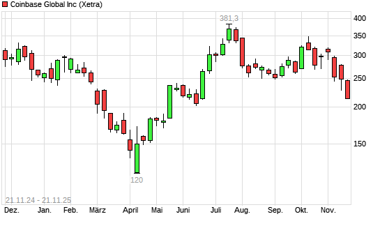 Mit dem Rücksetzer auf 207,55 EUR hat die Coinbase-Aktie (ISIN US19260Q1076) am 20.11.2025 ein neues 6-Monats-Tief erreicht und damit den Kurs vom 13.06.2025 eingestellt.Die Coinbase-Aktie ...weiterlesen
