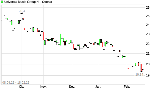 Mit dem Rücksetzer auf 19,38 EUR hat die Universal Music Group-Aktie (ISIN NL0015000IY2) am 17.02.2026 ein neues 12-Monats-Tief erreicht und damit den Kurs vom ...weiterlesen