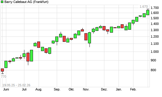 Mit dem Anstieg auf 1.670,00 EUR hat die Barry Callebaut-Aktie (ISIN CH0009002962) am 24.02.2026 ein neues 12-Monats-Hoch erreicht und damit den Kurs vom 20.02.2026 eingestellt.Die ...weiterlesen