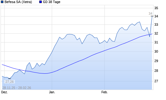 Mit dem Anstieg auf 33,82 EUR hat die Befesa-Aktie am 27.02.2026 die 38-Tage-Linie nach oben gekreuzt.Die Befesa-Aktie befindet sich seit dem 02.12.2025 im langfristigen Aufwärtstrend ...weiterlesen