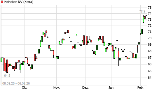 Mit dem Anstieg auf 73,22 EUR hat die Heineken-Aktie (ISIN NL0000009165) am 05.02.2026 ein neues 6-Monats-Hoch erreicht und damit den Kurs vom 04.02.2026 eingestellt.Die ...weiterlesen