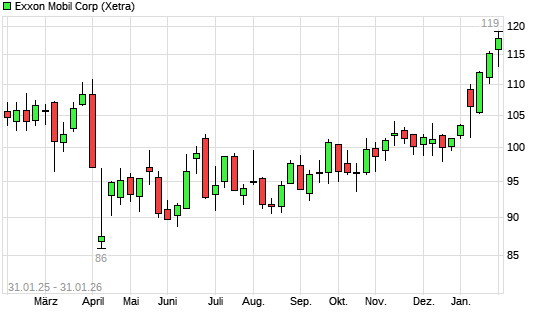 Mit dem Anstieg auf 118,20 EUR hat die Exxon Mobil-Aktie (ISIN US30231G1022) am 30.01.2026 ein neues All-Time-High erreicht und damit den Kurs vom 22.11.2024 eingestellt.Die Exxon Mobil-Aktie ...weiterlesen