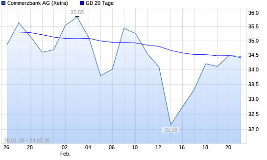 Mit dem Anstieg auf 34,60 EUR hat die Commerzbank-Aktie am 23.02.2026 die 20-Tage-Linie nach oben gekreuzt.Die Commerzbank-Aktie befindet sich seit dem 28.11.2024 im ...weiterlesen
