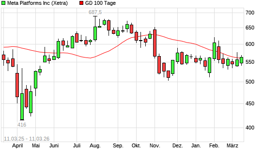 Mit dem Anstieg auf 565,10 EUR hat die Meta Platforms (ex Facebook)-Aktie am 10.03.2026 die 100-Tage-Linie nach oben gekreuzt.Die Meta Platforms (ex Facebook)-Aktie befindet sich seit ...weiterlesen