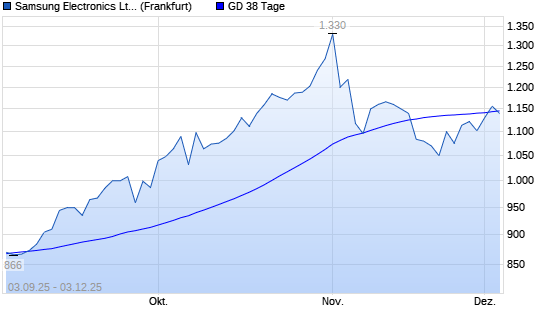 Mit dem Anstieg auf 1.156,00 EUR hat die Samsung-Aktie am 02.12.2025 die 38-Tage-Linie nach oben gekreuzt.Die Samsung-Aktie befindet sich seit dem 24.06.2025 im langfristigen Aufwärtstrend und ...weiterlesen