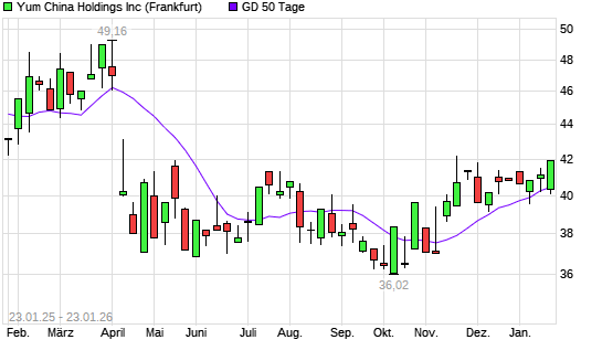 Mit dem Anstieg auf 41,91 EUR hat die Yum China Holdings-Aktie am 22.01.2026 die 50-Tage-Linie nach oben gekreuzt.Die Yum China Holdings-Aktie befindet sich seit dem 12.12.2025 im langfristigen ...weiterlesen