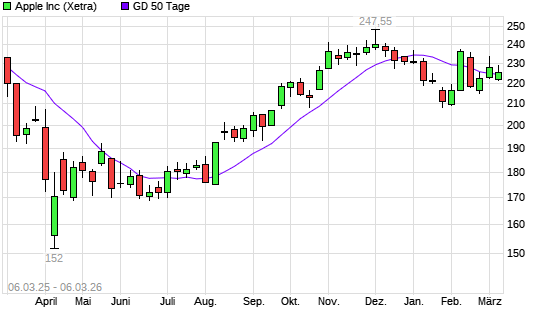 Mit dem Rücksetzer auf 223,00 EUR hat die Apple-Aktie am 05.03.2026 die 50-Tage-Linie nach unten gekreuzt.Die Apple-Aktie befindet sich seit dem 15.09.2025 im ...weiterlesen