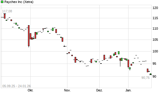 Mit dem Rücksetzer auf 90,00 EUR hat die Paychex-Aktie (ISIN US7043261079) am 23.01.2026 ein neues 3-Jahres-Tief erreicht und damit den Kurs vom 22.01.2026 eingestellt.Die Paychex-Aktie ...weiterlesen