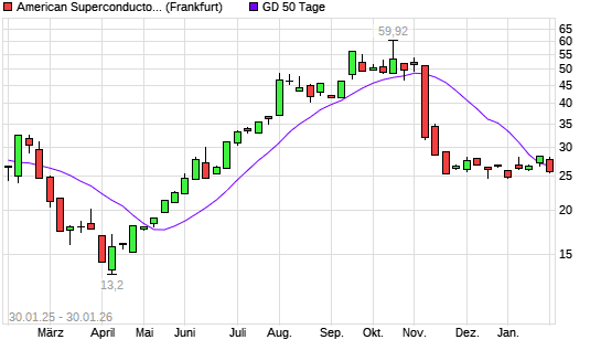 Mit dem Rücksetzer auf 25,89 EUR hat die American Superconductor-Aktie am 29.01.2026 die 50-Tage-Linie nach unten gekreuzt.Die American Superconductor-Aktie befindet sich seit dem 11.11.2025 ...weiterlesen
