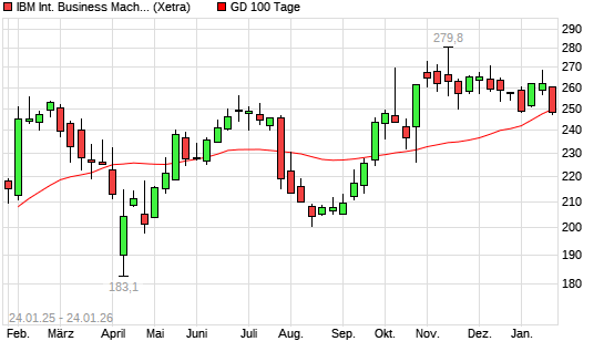 Mit dem Rücksetzer auf 248,85 EUR hat die IBM-Aktie am 23.01.2026 die 100-Tage-Linie nach unten gekreuzt.Die IBM-Aktie befindet sich seit dem 22.09.2025 im langfristigen Aufwärtstrend und ...weiterlesen