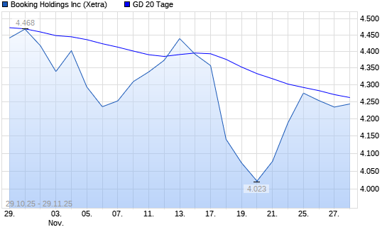 Mit dem Rücksetzer auf 4.232,00 EUR hat die Booking Holdings-Aktie am 28.11.2025 die 20-Tage-Linie nach unten gekreuzt.Die Booking Holdings-Aktie befindet sich seit dem 29.10.2025 im langfristigen ...weiterlesen