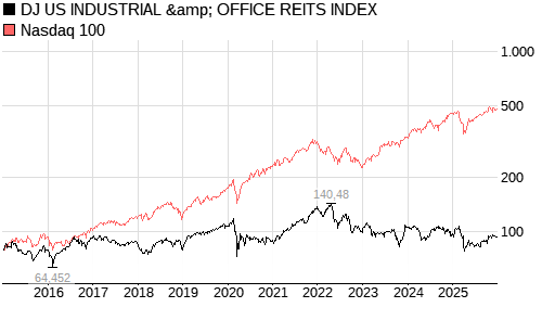 DJ US INDUSTRIAL & OFFICE REITS INDEX / Nasdaq 100 Vergleich