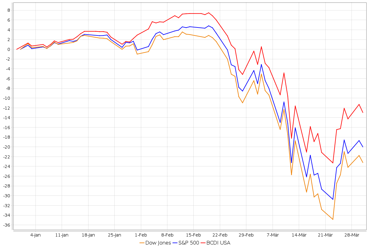 Thomas Müller: Der Dow Jones verlor 23,2%, und das war mit einem Abstand von fünf Prozentpunkten gegenüber 1938 der größte Q1-Einbruch in der Geschichte der US-Börsen! Auch der S&P 500 verzeichnete mit -20,0% ein Rekord-Minus, während unser BCDI USA nur 13,0% abgab. In Europa bedeuteten -25,0% im Dax sowie -23,0% im Stoxx Europe 600 und -25,6% im Euro Stoxx 50 ebenfalls historische Negativ-Rekorde. Die galten auch für unseren BCDI, der jedoch um lediglich 13,0% zurücksetze. Selbst der MSCI World verlor 21,4% – so viel wie noch nie in einem ersten Quartal –, während der boerse.de-Weltfonds um 13,2% nachgab und der boerse.de-Aktienfonds um 12,7%.