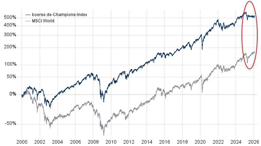 Bei all den Analysen ist natürlich zu berücksichtigen, dass es sich bei der Betrachtung des Jahres 2025 lediglich um eine Momentaufnahme handelt. In der nachfolgenden Abbildung ist die Entwicklung des 2002 eingeführten boerse.de-Champions-Index (BCI) dem MSCI World Preisindex (jeweils in Euro) in einem Langfristvergleich gegenübergestellt.