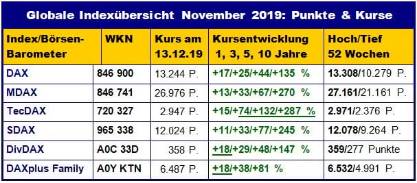 Wichtige Eckdaten bis Nov. 2019 in deutschen Indizes