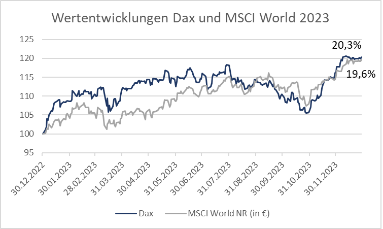 Lassen Sie uns doch noch einmal das Jahr 2023 rekapitulieren. In der nachfolgenden Abbildung sind die Entwicklungen des Dax und des MSCI World NR Index im Jahresverlauf 2023 aufgeführt. Während der eine Index die typische Sicht eines deutschen Anlegers widerspiegelt, repräsentiert der andere die Entwicklung der internationalen Aktienmärkte (Anmerkung: die beiden Indizes unterscheiden sich dahingehend, dass beim Dax die Bruttodividenden in die Wertentwicklung eingerechnet sind und beim MSCI World die Nettodividenden).