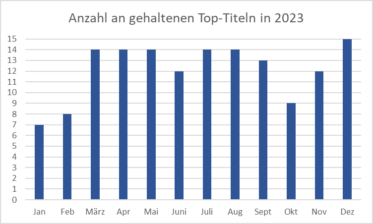Die nachfolgende Abbildung zeigt, in wie vielen Titeln das BOTSI-gesteuerte zweite Teilportfolio im Jahresverlauf 2023 investiert war. Da die Strategie monatlich neu angepasst wird, ergeben sich insgesamt zwölf Zeitpunkte, an denen die Anzahl an investierten Top-Titeln festgelegt wird.