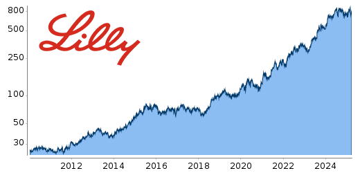 Heute zählt Eli Lilly zu den forschungsstärksten Pharmaunternehmen der Welt — mit einem besonderen Schwerpunkt auf chronische Krankheiten, die weltweit immer häufiger auftreten. Dazu gehören etwa Diabetes, starkes Übergewicht, Alzheimer, verschiedene Krebsarten und entzündliche Erkrankungen wie Rheuma. Wer sich mit wirksamen Medikamenten dauerhaft unentbehrlich für Patienten macht, sorgt für klingelnde Kassen, was sich auch im Kurs widerspiegelt: In den vergangenen zehn Jahren legte die Aktie des Pharma-Champions im Mittel um 28% per annum zu.