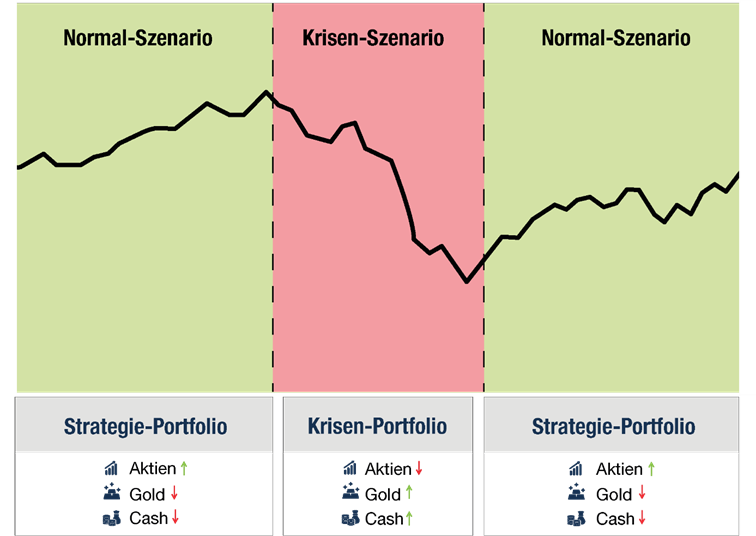 „myChampionsPREMIUM: Die Vermögensverwaltung nach institutionellen Standards“ ausführlich präsentiert. Die transparente Darstellung der myChampionsPREMIUM-Vermögensverwaltung ist jedoch nur deshalb möglich, weil die zugrundeliegende Anlagestrategie auf einem festen Regelwerk basiert. Eine Besonderheit von myChampionsPREMIUM liegt in der Taktischen Asset Allocation, bei der zwischen einem Normal-Szenario und einem Krisen-Szenario unterschieden wird. Während im Normal-Szenario das sogenannte Strategie-Portfolio gehalten wird, erfolgt bei einem Übergang in ein Krisen-Szenario eine Umschichtung in ein konservativer aufgestelltes Krisen-Portfolio. Dieses Vorgehen wird umfassend in dem Beitrag