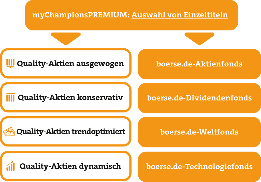 Um dieses Problem zu umgehen, werden bei myChampionsPREMIUM die verschiedenen Segmente an Qualitätsaktien mithilfe der vier boerse.de-Fonds abgebildet. Die folgende Grafik veranschaulicht diesen Sachverhalt: