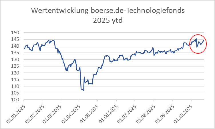 Diese positiven Entwicklungen spiegelten sich dann auch im boerse.de-Technologiefonds wider, dessen thesaurierende Tranche (WKN: TMG4TT) 2023 eine tolle Rendite von +32% erzielen konnte und 2024 eine Rendite von +25% aufwies. Und wie ging es 2025 weiter? Auch Nicht-Börsianer können sich sicherlich noch an das von Donald Trump ausgelöste Zoll-Chaos erinnern, dessen negative Auswirkungen am Aktienmarkt ab Februar tiefe Spuren hinterließen. Die nachfolgende Abbildung zeigt die Wertentwicklung year-to-date der thesaurierenden Tranche des boerse.de-Technologiefonds per 22. Oktober 2025.