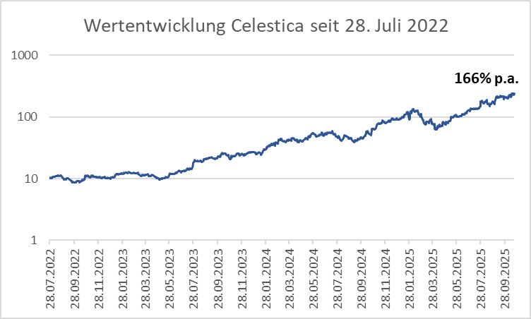 Die Aktie wies am 28. Juli 2022 einen Wert von zehn Euro auf, der per heute (22. Oktober 2025) auf 241 Euro gestiegen ist, was einer durchschnittlichen Rendite von 166% p.a. entspricht. Das Erstinvestment im Juli 2022 in Höhe von 10.000 Euro ist dank Kursgewinnen und den damit zusätzlich getätigten Käufen auf 570.000 Euro gestiegen.