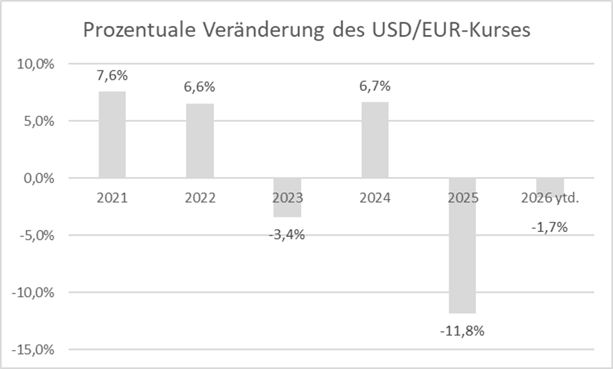 Zur Beurteilung des Themas Währungseinfluss ist es natürlich sinnvoll, nicht nur die aktuelle Situation (2026 Year-to-Date) oder das vergangene Jahr 2025 zu betrachten, sondern auch die Jahre davor. In der nachfolgenden Abbildung ist die prozentuale Veränderung des USD/EUR-Wechselkurses für die Jahre 2021 bis 2025 und 2026 Year-to-Date (bis 28. Januar 2026) dargestellt: