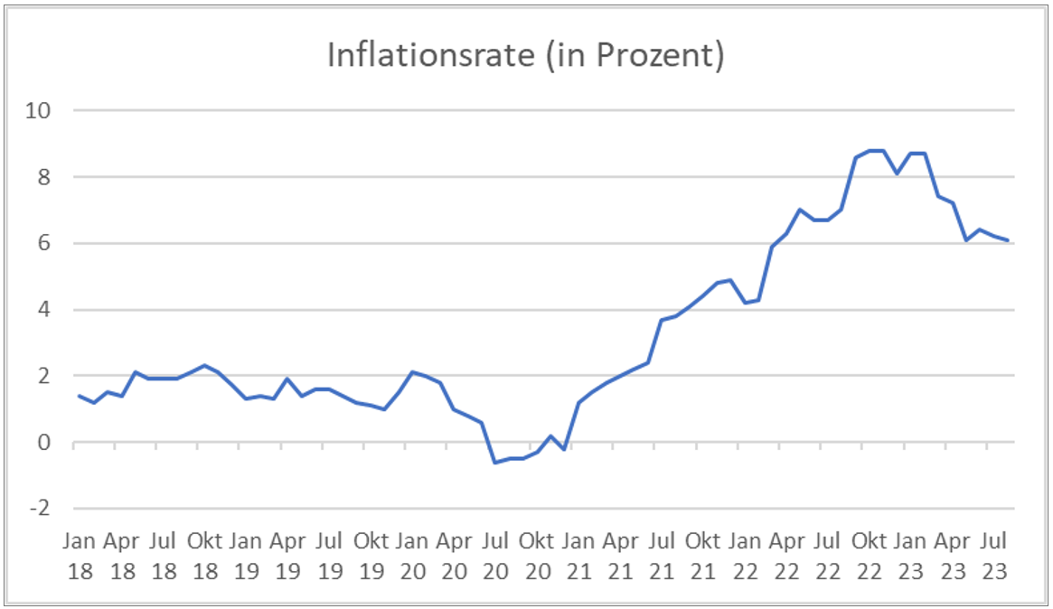 Wie aus der Grafik ersichtlich ist, hat die Inflationsrate in den vergangenen Monaten zwar leicht abgenommen, jedoch liegt sie per August 2023 immer noch bei 6,1%.