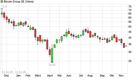 Mit dem Rücksetzer auf 33,50 EUR hat die Bitcoin Group-Aktie (ISIN DE000A1TNV91) am 10.11.2025 ein neues 6-Monats-Tief erreicht und damit den Kurs vom 07.11.2025 eingestellt.Die Bitcoin ...weiterlesen