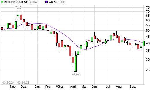 Mit dem Anstieg auf 40,80 EUR hat die Bitcoin Group-Aktie am 02.10.2025 die 50-Tage-Linie nach oben gekreuzt.Die Bitcoin Group-Aktie befindet sich seit dem 25.07.2025 im langfristigen Abwärtstrend ...weiterlesen